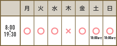 受付時間は平日は8時から19時、土日祝日は8時から18時となります。